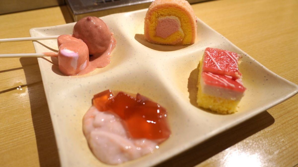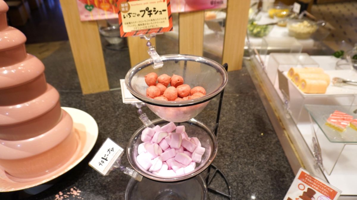 いちごチョコがけマシュマロ、プチシューにミニケーキ、ロールケーキ、ゼリー、フルーチェです。