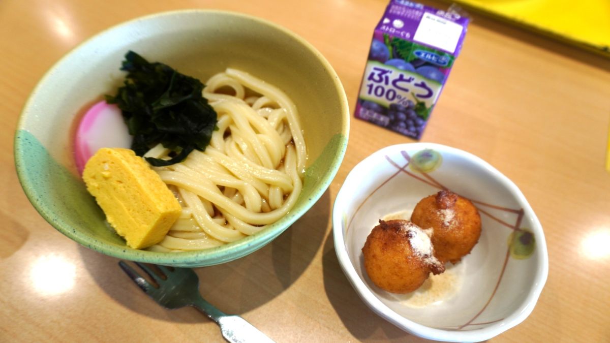小うどん(ぶっかけ・冷)とうどーなつ2個、選べるジュースはぶどうをチョイス。