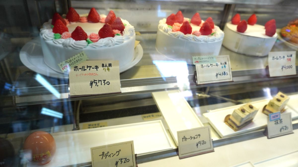 入ってすぐのショーケースには作中でも登場したホールケーキが!↓