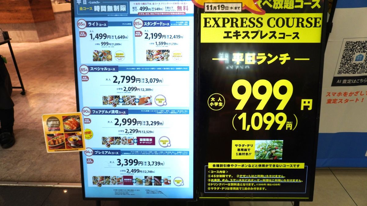 2025年11月19日(水)までの限定で時間制限ありの平日ランチ1099円もあるみたい。